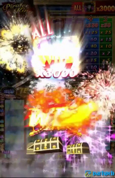 When the Bomb symbol appears in the middle of the third reel the player will have a chance to play the Bomb bonus. The bomb in the center will explode to reveal scattered Treasure Chest symbols all over the screen. The player can then choose which Chests to open and reveal the prize inside.