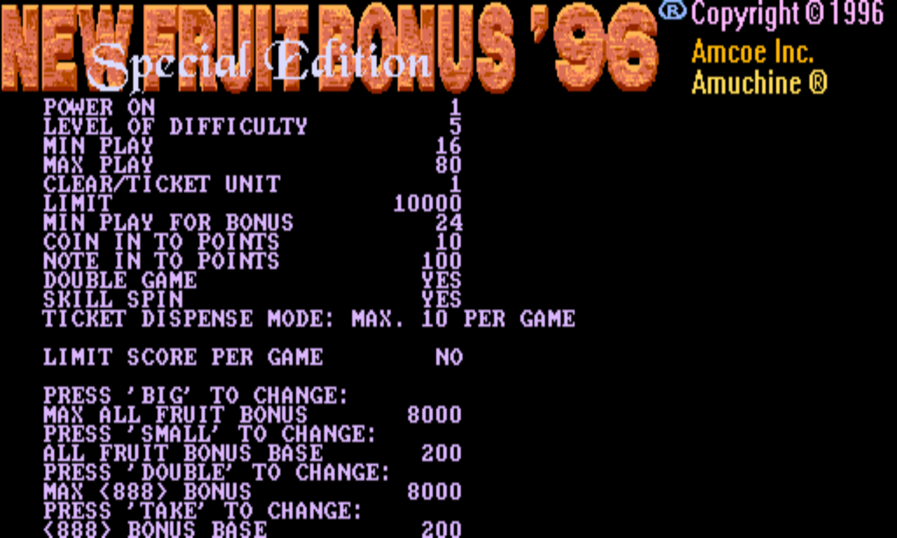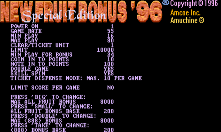 Max Of All Fruit Bonus, Base Of All Fruit Bonus, Max Of 888 Bonus, And Base Of 888 Bonus Can Be Adjusted Individually In Confirm Screen, Instructions Are Shown On Confirm Screen. If Present Bonus Point Is Lower Than Newly Changed Base, Bonus Point Will Be Changed To New Base Immediately. If Present Bonus Point Is Higher Than Newly Changed Base, New Base Will Be Used Only After Bonus Hit. If Present Bonus Point Is Higher Than Newly Changed Max Bonus Point Will Be Changed To New Max Immediately. Caution : Always Set Max Bonus Equal Or Higher Than Base Bonus.